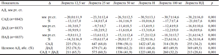 Антигипертензивная эффективность лечения. Данные об исходном уровне САД и его изменении через 8 нед наблюдения были представлены для 8842 (89,2%) больных из 9915, об уровне ДАД — для 8837 (89,1%). У больных с неизвестными результатами лечения в начале исследования имелось более низкое САД (161±16 мм рт.ст. по сравнению с 164±16 мм рт.ст. у больных с известными итоговыми значениями АД; p<0,001), они чаще начинали лечение в исследовании с лозартана в дозе 12,5 мг (6,2 и 3,3% соответственно; p<0,001), реже — с фиксированной комбинации лозартана 50 мг и ГХТ 25 мг (29,1 и 33,2% соответственно; p<0,001).
