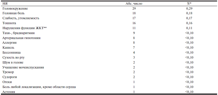 Примечание. * — рассчитано для больных, получивших хотя бы одну таблетку лозартана в виде монопрепарата или в комбинации с ГХТ (n=9948); ** — суммированы случаи возникновения боли в эпигастрии, диареи, других диспепсических явлений. НЯ — нежелательные явления; ЖКТ — желудочно-кишечный тракт; ГХТ — гидрохлоротиазид.