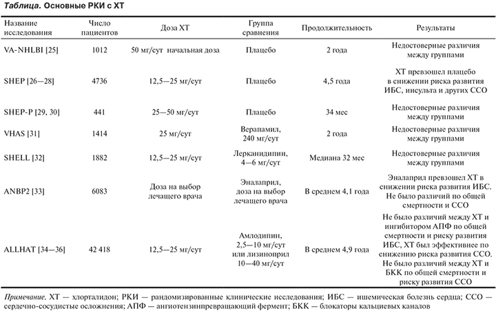Эффективность ХТ в целом ряде проведенных испытаний и его широкое использование в клинической практике определили выбор организаторов одного из крупнейших РКИ ALLHAT, посвященного изучению влияния различных типов антигипертензивного лечения на заболеваемость и смертность пациентов с АГ [38, 39]. В это исследование было рандомизировано более 42 тыс. пациентов с АГ и либо с известными ССЗ, либо с факторами риска их развития. Срок наблюдения составил 4,8 года (см. таблицу). ХТ в дозе 12,5—25 мг/сут не уступил таким мощным конкурирующим препаратам, как ингибитор АПФ лизиноприл и антагонист кальция амлодипин, по влиянию на комбинированную первичную конечную точку (коронарная смертность и нефатальные инфаркты миокарда). При оценке вторичных конечных точек (частота возникновения инсульта, госпитализации в связи с хронической сердечной недостаточностью, частота достижения целевого АД) были выявлены преимущества ХТ над этими препаратами.