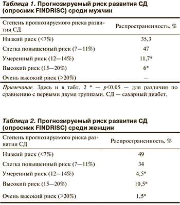 Главной задачей настоящего исследования было определение риска развития СД у врачей терапевтического профиля — мужчин и женщин. Для определения степени риска развития СД с помощью опросника FINDRISC необходимо ответить на вопросы, связанные с антропометрическими данными, семейным анамнезом, уровнем АД и особенностью питания и образа жизни. В анкете предложено несколько вариантов ответа, по результатам которых рассчитывается суммарная оценка. При оценке менее 7 баллов определялся низкий риск развития СД 2-го типа, при оценке от 7 до 11 баллов — слегка повышенный, умеренный уровень риска констатировали при оценке 12—14 баллов, высокий уровень риска — при оценке 15—20 баллов, и очень высокий уровень — при оценке более 20 баллов [18].