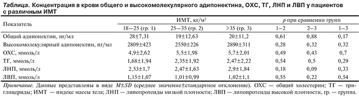 Указанные группы по ИМТ не различались по концентрации общего и высокомолекулярного адипонектина в крови, ОХС, ТГ, ЛНП, ЛВП в крови (см. таблицу).