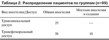 Больные были разделены на 2 исследуемые группы. В группу А включены 25 пациентов, которым ТПАК выполнялось из трансапикального доступа в условиях общей анестезии. В группу Б включены 74 пациента, которым ТПАК выполнялось из трансфеморального доступа. В свою очередь группа Б была разделена на 2 подгруппы: Б1 и Б2. В подгруппе Б1 (n=18) операция выполнялась под местной анестезией в сочетании с седацией. В подгруппе Б2 (n=56) операция выполнялась в условиях общей анестезии. Распределение пациентов по группам представлено в табл. 2.