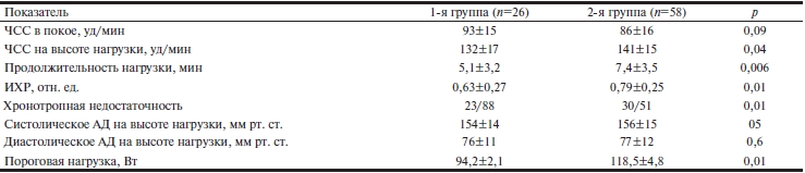 Результаты ВЭМ в сравниваемых группах представлены в табл. 2. У больных 2-й группы выявлены лучшие показатели нагрузочного тестирования. Так, они переносили нагрузки более продолжительное время (в 1,45 раза), у них были выше хронотропный резерв (в 1,25 раза) и более высокая ЧСС при нагрузке (в 1,07 раза). При этом в 1-й группе чаще (в 1,72 раза) выявлялась хронотропная недостаточность, и пороговая нагрузка оказалась существенно ниже (в 1,25 раза), чем у пациентов 2-й группы.