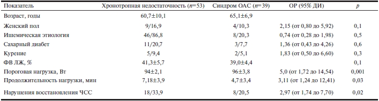 Приведенные данные свидетельствуют, что наиболее неблагоприятными факторами у пациентов с ОАС можно считать низкий уровень достигаемой пороговой нагрузки, снижение общего времени работы на велоэргометре и нарушение восстановления ЧСС в течение 1-й минуты после прекращения исследования.