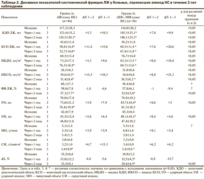 При оценке систолической функции ЛЖ (табл. 2) обнаружен выраженный рост конечного систолического объема (КСО) ЛЖ, статистически значимый для пациентов обоих классов НС (р<0,05) уже в течение 1 года. Снижение фракции выброса (ФВ) ЛЖ подтверждалось только через 2 года наблюдения.
