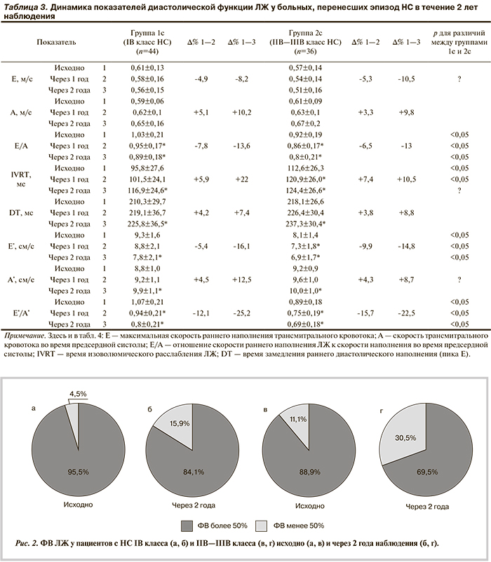 Отношения диастолических пиков наполнения и расслабления (Е/А и E′/A′) были наиболее чувствительными показателями при динамическом исследовании диастолической функции (табл. 3). У пациентов, перенесших эпизод НС IB класса, через 1 год статистически значимо снизились соотношения пиков наполнения и расслабления ЛЖ (Е/А — на 7,8%, E′/A′ — на 12,1%), темпы снижения не уменьшились и через 2 года. Прогрессирование диастолической дисфункции у пациентов с НС IIB—IIIB класса в течение 1 года помимо этого сопровождалось статистически значимым увеличением времени изоволюметрического расслабления (IVRT) и снижением пика E′; изменения прогрессировали в течение всего периода наблюдения.