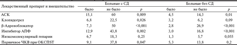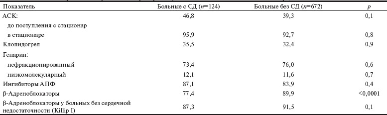 Медикаментозное лечение в стационаре. В табл. 3 представлены сравнительные данные о частоте использования основных лекарственных средств в стационаре у больных с СД и без него. Можно видеть, что значимые различия по частоте использования большинства препаратов не выявлены, за исключением, β-адреноблокаторов, которые больные СД получали достоверно реже.