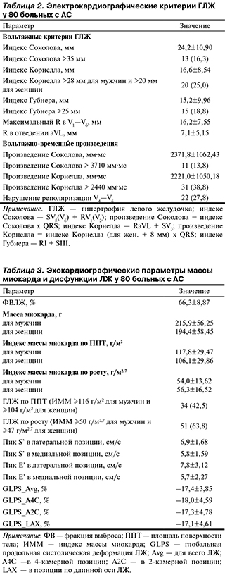 Таким образом, у обследованных нами 80 больных с АС, из которых почти у 50% имелась повышенная ММЛЖ по данным ЭхоКГ, мы подтвердили низкую чувствительность ЭКГ-критериев ГЛЖ, относительную ценность только индекса Корнелла и его производных.