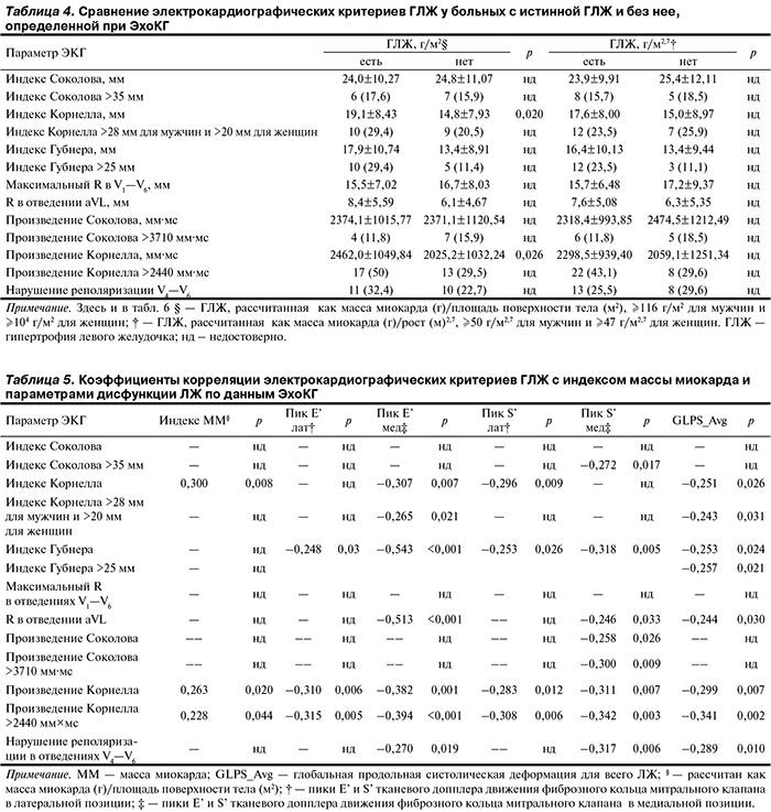 Вольтажные индексы ГЛЖ (Соколова, Корнелла и Губнера) рассчитывали как RV5(V6) + SV1(V2), RaVL + SV3 и RI + SIII соответственно. Наличие ГЛЖ считалось более вероятным при индексе Соколова >35 мм, индексе Корнелла >28 мм для мужчин и >20 мм для женщин, индексе Губнера >25 мм. Кроме того, к вольтажным ЭКГ-признакам ГЛЖ были отнесены максимальный R в отведениях V1—V6 и величина R в отведении aVL.