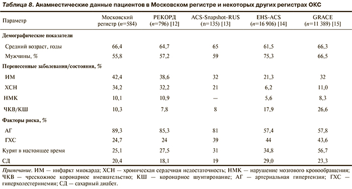 При этом полученные в Московском регистре анамнестические характеристики включенных пациентов в целом соответствовали данным из других регистров [12—15] (табл. 8) и в наибольшей степени совпадали с российским регистром РЕКОРД [12] и данными российских стационаров из регистра ACS-Snapshot [13]. Это косвенно указывает на то, что когорта включенных пациентов по своим характеристикам соответствует истиной картине.