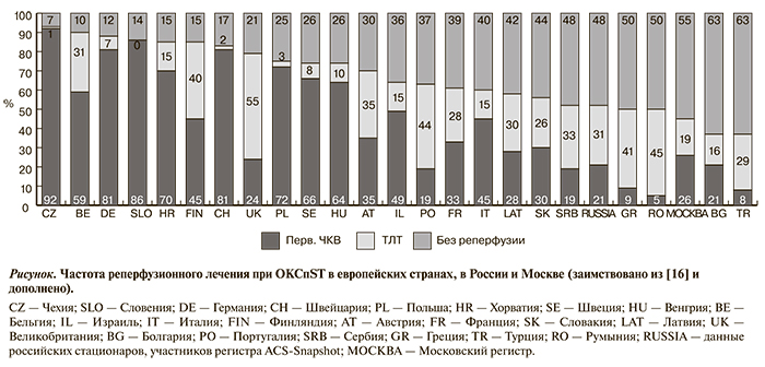 Обсуждая вопрос о лечении пациентов с ОКСпST, в первую очередь следует оценить частоту применения реперфузионной терапии, особенно первичного ЧКВ. Для наглядности оценки полученных результатов данные о частоте реперфузионной терапии в Московском регистре представлены вместе с данными европейских стран [16] (см. рисунок). Можно видеть, что частота проведения реперфузионной терапии в Москве может быть оценена как очень низкая. К сожалению, протокол регистра не позволял узнать причины, по которым первичное ЧКВ не было проведено. Но одна из них очевидна — догоспитальная ТЛТ, которая проводилась только тем пациентам, которых госпитализировали в инвазивные стационары (т. е. туда, где есть возможность сделать первичное ЧКВ). Впрочем, частота проведения ТЛТ также была очень невысокой. Обращает внимание, что почти в 1/3 случаев ТЛТ не была выполнена по причинам, не связанным с противопоказаниями или задержкой по времени, т. е. не вполне оправданно.