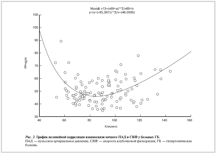 Полученные нами данные свидетельствуют о выраженной взаимосвязи высокого ночного пульсового артериального давления и снижения клубочковой фильтрации у больных артериальной гипертонией. Учитывая роль пульсового артериального давления как интегрального фактора, отражающего неблагоприятные изменения крупных сосудов и высокого ударного объема сердца, подтверждается значимость «постоянной» и «динамической» составляющих гипербарической нагрузки в формировании органных поражений, в частности почек.