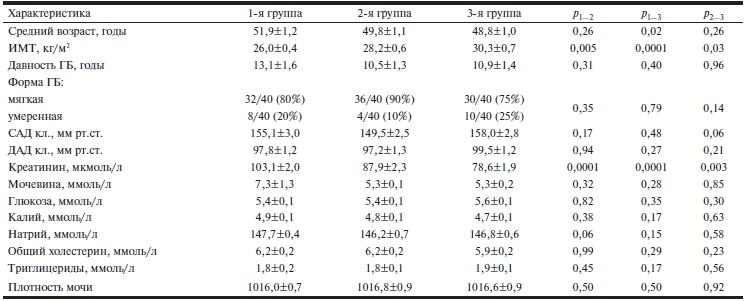 Результаты сравнения клинико-биохимических показателей в подгруппах представлены в табл. 1. Группы больных были сопоставимы по длительности ГБ. Отмечены тенденция к увеличению возраста больных в 1-й группе и статистически значимое увеличение индекса массы тела (ИМТ) от 1-й группы к 3-й. Группы были также сопоставимы по значениям биохимических показателей, за исключением уровня креатинина в крови, который достоверно уменьшался от 1-й группы ко 2-й. По выраженности АД группы также были сопоставимы: у большинства больных имелась «мягкая» форма ГБ (АГ 1-й степени).