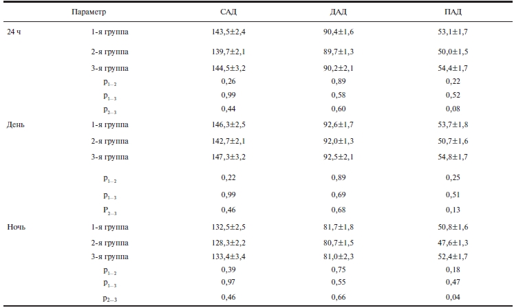 Между группами не было статистически значимых различий по клиническим значениям САД и ДАД (см. табл. 1). Однако выявлена тенденция к более высоким уровням клинического САД в 3-й группе по сравнению со 2-й. Результаты анализа показателей СПАД представлены в табл. 2—4. Несмотря на отсутствие статистически значимых различий по 24-часовым, дневным и ночным уровням САД и ДАД, самое низкое САД было во 2-й группе (см. табл. 2). В этой же группе были отмечены низкие уровни ПАД во всех временны́х отрезках, однако статистически значимое различие между группами выявлено по уровню ночного ПАД между 2-й и 3-й группами (см. табл. 2). Не выявлено статистически значимых различий по показателям нагрузки давлением для САД и ДАД во всех временны́х отрезках (см. табл. 3).