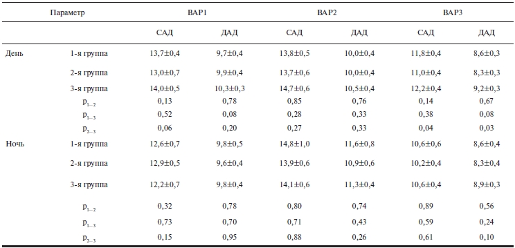 Примечание. ВАР1 — среднеквадратичное отклонение от средних значений САД и ДАД; ВАР2 — среднеквадратичное значение разности между последовательными измерениями АД; ВАР3 —стандартное отклонение значений АД от кривой суточного ритма АД.