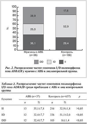 В ходе исследования проанализировано распределение генотипов гена ADRA2B среди пробандов с АВБ. Результаты представлены в табл. 2.