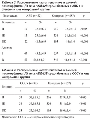 Целью настоящего исследования являлось изучение роли полиморфного аллельного варианта гена ADRA2B в развитии первичных нарушений проводимости сердца: атриовентрикулярных блокад (АВБ), СССУ.
