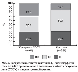 Кроме того, проанализировано распределение частот генотипов и аллелей гена ADRA2B среди мужчин и женщин c СССУ, а также в группе пробандов СССУ.