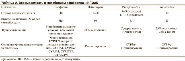 Значение почечного клиренса для терапии «новыми антикоагулянтами». В настоящее время для профилактики инсульта и системных эмболий из группы НПОАК российскому врачу доступны три препарата — пероральный ингибитор тромбина дабигатран и ингибиторы X фактора апиксабан и ривароксабан. Необходимо отметить, что все эти препараты выводятся в активном (неизмененном) виде почками с различной степенью элиминации. Наибольший почечный клиренс характерен для дабигатрана — 80% активного препарата выводится через почки. Почечный клиренс активного препарата для ингибиторов X фактора меньше — 33% ривароксабана и 25% для апиксабана. Именно почечный клиренс активного препарата определяет риск кумуляции у пациентов с умеренным/выраженным снижением функции почек. Такая ситуация для дабигатрана более вероятна, чем для ингибиторов X факторов (табл. 2).