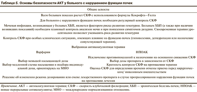 Нарушение функции почек является частой полиэтиологичной патологией, с которой приходится считаться терапевту и кардиологу, назначая больному антикоагулянтную терапию. Наличие у больного с фибрилляцией предсердий хронической болезни почек повышает риск развития как тромбоэмболических, так и геморрагических осложнений. Соблюдение рекомендаций, направленных на обязательную оценку функции почек у больных перед началом и на протяжении антикоагулянтной терапии, и правильный выбор режима дозирования позволяют повысить безопасность терапии.