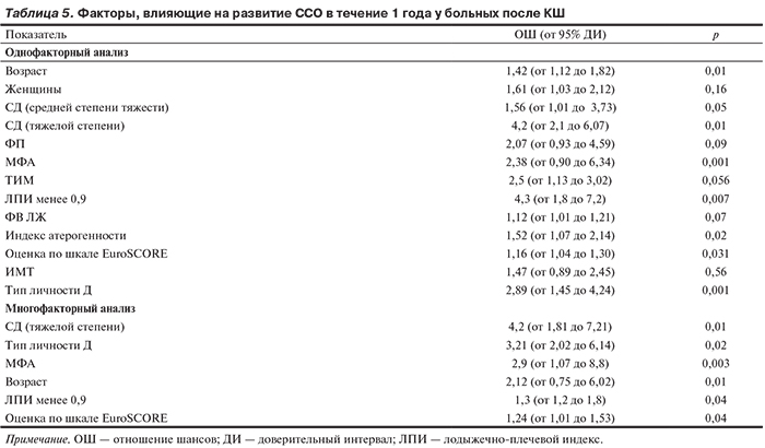 По данным однофакторного логистического регрессионного анализа (табл. 5) риск выявления комбинированной конечной точки в течение года после КШ в наибольшей степени увеличивало наличие типа личности Д (в 2,89 раза) и МФА (в 2,38 раза). Кроме того, статистически значимо повышали риск развития ССО такие факторы, как возраст больных, наличие СД, ЛПИ менее 0,9, связанный с операцией риск по EuroSCORE, индекс атерогенности. При множественном регрессионном анализе независимое влияние на риск развития комбинированной конечной точки сохранилось для таких показателей, как тип личности Д (р=0,02), наличие МФА (р=0,003), ЛПИ менее 0,9 (р=0,04), СД тяжелой степени (р=0,01) и связанный с операцией риск по EuroSCORE (р=0,04).
