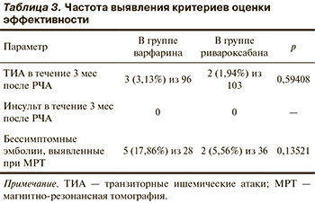 Группа ривароксабана: 2 случая ТИА, 3 случая новых бессимптомных церебральных эмболий, выявленных при МРТ.