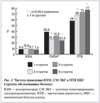 Анализируя результаты нагрузочных тестов (рис. 2), мы отметили, что показатели ВЭМ не выявили статистически значимых межгрупповых различий (р=0,844), данное исследование проводилось довольно редко во всех группах (от 7,8 до 10,6% случаев). При этом СМ ЭКГ чаще выполнялось у больных без окклюзионно-стенотических изменений коронарного русла (р<0,001). Признаки СКН преимущественно были зарегистрированы также в этой группе — 10,7, 5,3, 4,6 и 3,6% соответственно (р=0,006). Учитывая клинические признаки стенокардии, пол и возраст пациента, мы рассчитали ПТВ наличия поражения коронарного русла — у больных с наличием поражения она была достоверно выше, чем у лиц без стенозов КА (p<0,001). Однако в группе без стенозов КА ПТВ ИБС была высокой (медиана 58%).