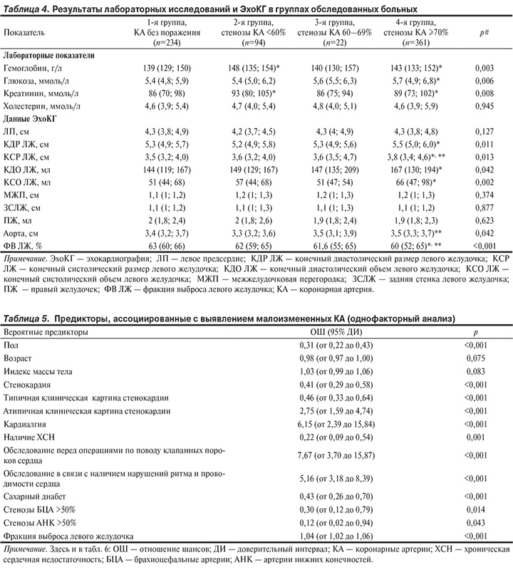 Анализ лабораторных данных показал (табл. 4), что уровень гемоглобина и глюкозы был ниже у пациентов группы без поражения КА в сравнении с группой с гемодинамически значимыми стенозами КА (p=0,003 и р=0,006 соответственно). При этом уровень креатинина у больных группы без поражения КА был ниже, чем в остальных группах (р=0,008). По результатам ЭхоКГ размеры и объемы полости ЛЖ в группе с гемодинамически значимыми стенозами КА превышали данные параметры в группе без поражения КА (р<0,05). ФВ ЛЖ в группе пациентов без стенозов КА была достоверно выше, чем в группе с пограничным и гемодинамически значимым поражением КА (р<0,001).