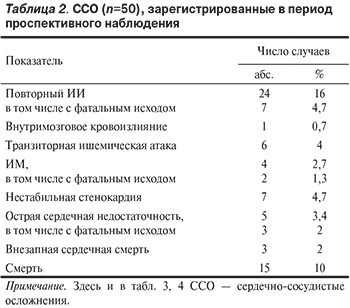 За время наблюдения у 37 (25%) пациентов зарегистрировано 50 ССО, учитываемых в рамках СКТ, при этом у 6 (16%) из 37 пациентов последовательно развивались церебральные и кардиальные нарушения (табл. 2). У 15 (10%) больных вследствие сердечно-сосудистых причин наступила смерть. По экстренным показаниям у 2 больных была выполнена коронарная ангиопластика со стентированием, у 1 — каротидная эндартерэктомия. В среднем по группе первое церебральное осложнение развилось через 20 (9; 33) мес, первое кардиальное — через 21 (15; 44) мес. Значительного различия во времени наступления первого церебрального или кардиального осложнения не было. Кумулятивный риск развития ССО в среднем через 3 года (35,6 мес) составил 19,3%, а кумулятивная доля больных с летальным исходом — 9%.