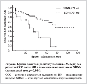Вопросы состояния вегетативного гомеостаза у больных с ИИ находятся в фокусе внимания исследователей [25, 26]. Научная гипотеза состоит в том, что вегетативный дисбаланс вызывает дизрегуляцию гомеостаза и может задолго предшествовать клинически значимым осложнениям [27, 28]. Соответственно оценка состояния вегетативной регуляции может предоставить возможность прогнозирования ССО и в дальнейшем путем оптимизации превентивных мероприятий повысить эффективность их профилактики. SDNN — показатель, характеризующий суммарную вегетативную активность и косвенно отражающий возможности адаптации в изменяющихся условиях внешней и внутренней среды организма [6]. Уменьшение этого показателя соответствует снижению резерва адаптации, причем это касается всех составляющих — как симпатического (НЧ), так и парасимпатического (ВЧ, SDNNi) звена регуляции, а также вагосимпатического баланса [28]. В нашем исследовании установлено самостоятельное значение ВРС как прогностического фактора ССО после ИИ, сохраняющееся после введения поправки на возраст больных и не зависящее от наличия аритмий. Ранее в кардиологической клинике было установлено, что изменение ВРС, а именно снижение показателя SDNN менее 70 мс, ассоциируется с ухудшением прогноза у больных после ИМ с фракцией выброса ЛЖ менее 35% [29—31]. Вероятно, снижение ВРС является следствием совокупных изменений не только сердца, но и головного мозга, что согласуется с данными литературы [32]. По всей видимости, пороговая величина SDNN, равная 70 мс, имеет универсальное значение для прогнозирования ССО после перенесенного ИМ и ИИ.