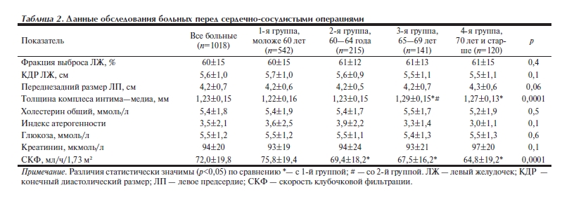 Таблица 2. Данные обследования больных перед сердечно-сосудистыми операциями.