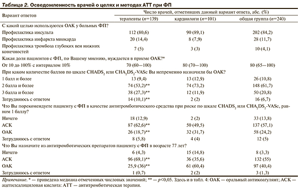 В табл. 2 приведены мнения опрошенных об АТТ при ФП и ее режимах.