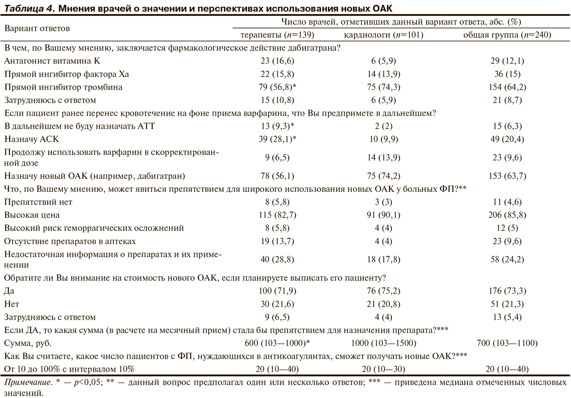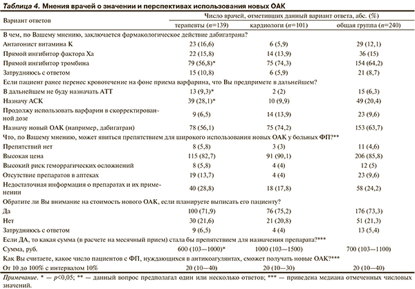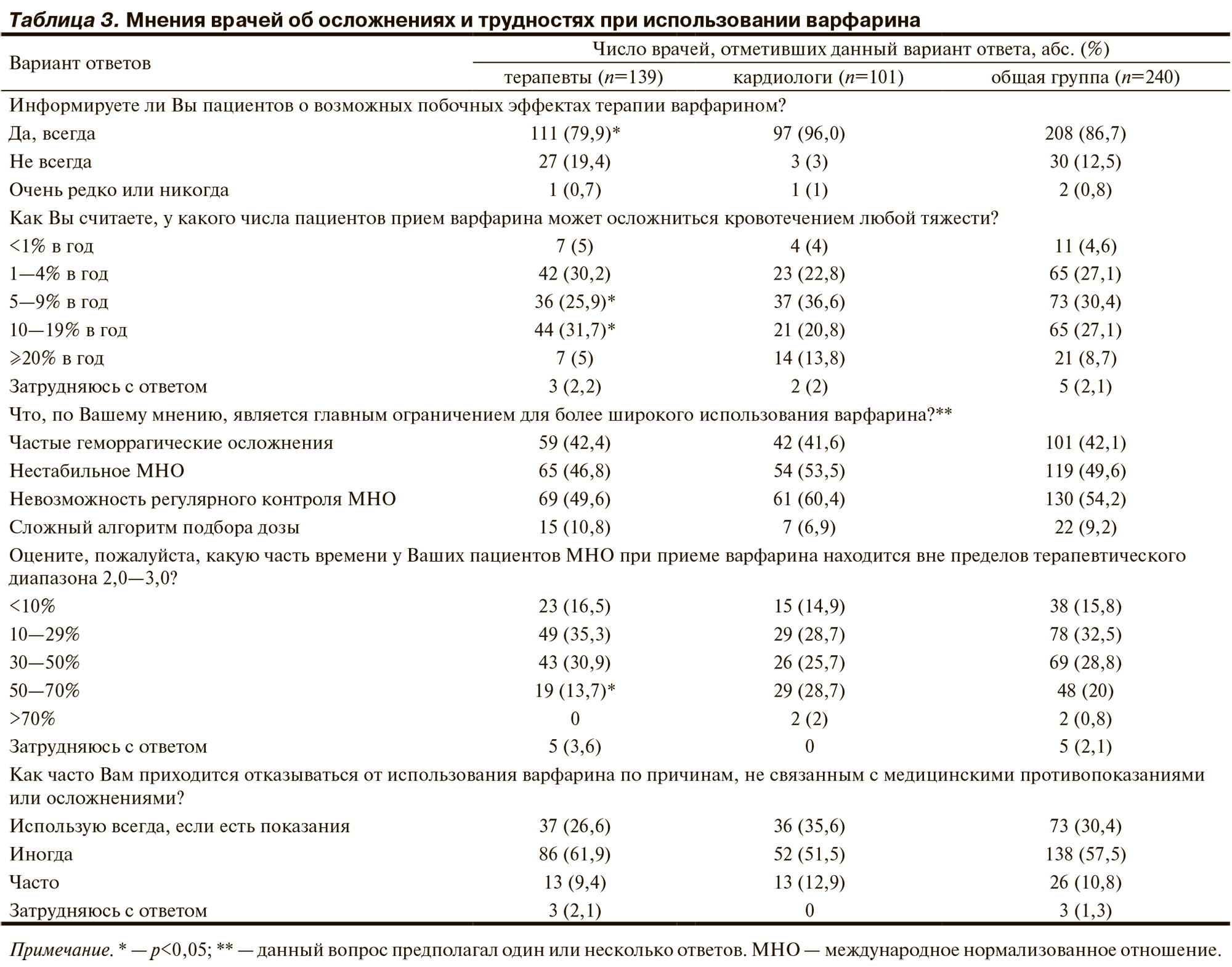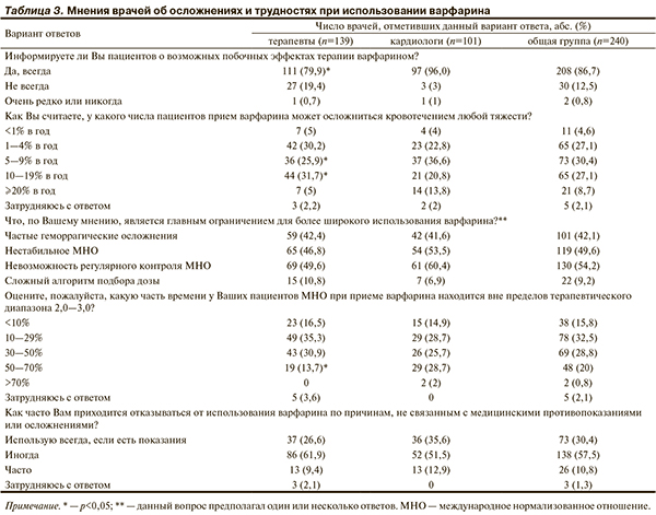 В табл. 3 приведены результаты блока вопросов об осложнениях лечения АВК (варфарина) и выявлении барьеров для их широкого применения.