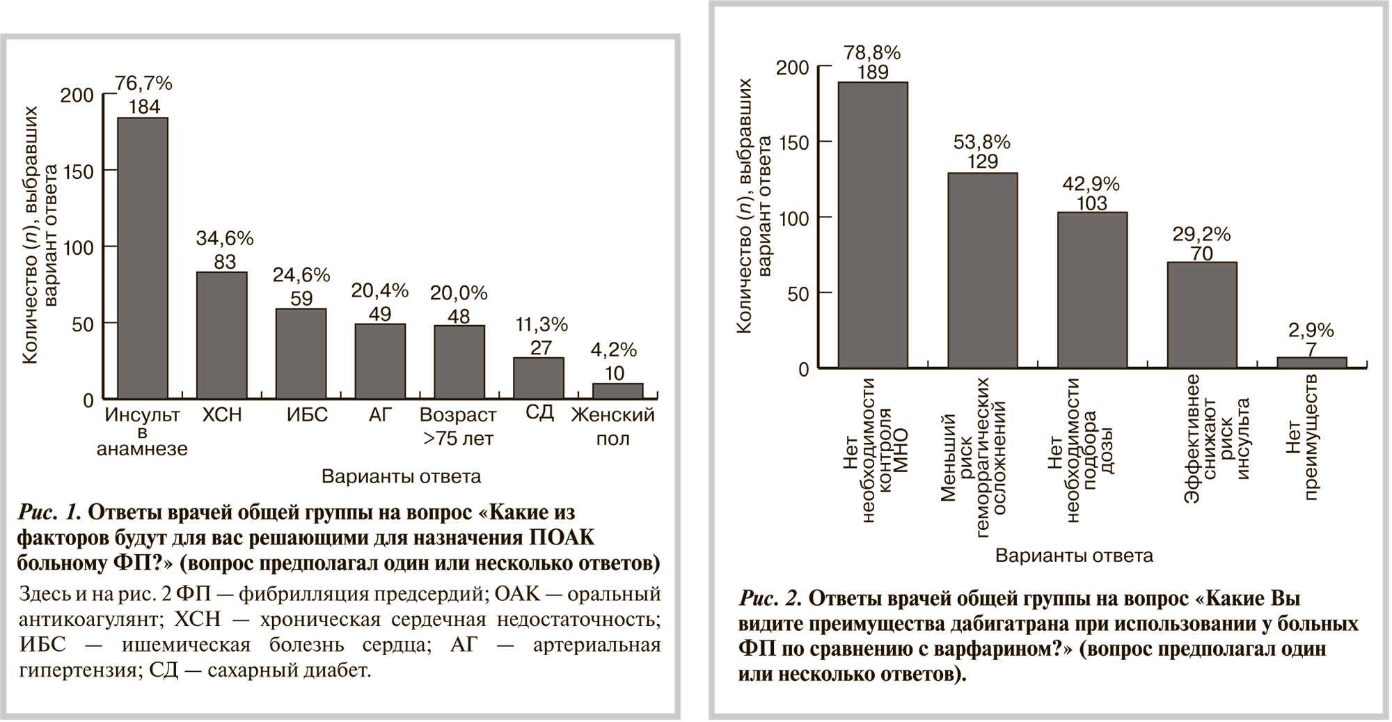 Фибрилляция предсердий (ФП) — одна из наиболее часто встречающихся аритмий сердца, заболеваемость которой с каждым годом растет [1, 2]. Мозговой инсульт вследствие тромбоэмболии относится к самым тяжелым осложнениям данного заболевания. Частота развития инсульта при ФП значительно превышает аналогичный показатель у лиц с синусовым ритмом [3]. Современная стратегия профилактики системных эмболий при ФП включает регулярную оценку вероятности развития инсульта, использование антитромботических препаратов с доказанным эффектом и учет риска развития геморрагических осложнений [4, 5]. Данных о том, насколько строго российские врачи следуют этим рекомендациям, в научной литературе недостаточно. Одной из главных проблем профилактики кардиоэмболического инсульта остается назначение неоптимальных и малоэффективных режимов антитромботической терапии (АТТ) [6]. Не совсем понятно, что лежит в основе этой проблемы: трудности лабораторного мониторинга, сложный алгоритм подбора дозы, низкая приверженность пациентов или недостаточная информированность врачей. С появлением новых оральных антикоагулянтов (ОАК), в частности дабигатрана, впервые за многие десятилетия появилась реальная альтернатива антагонистам витамина К (АВК), прежде всего, варфарину. Клинические преимущества новых ОАК очевидны. Насколько готовы врачи использовать новые ОАК в повседневной практике? Помогут ли новые ОАК уменьшить терапевтическую инертность и повысить приверженность врачей выполнению рекомендаций? Мы не встретили в отечественной литературе исследований, посвященных анализу опросов врачей по данной проблеме. Это и определило цель работы: изучить мнения терапевтов и кардиологов о проблеме профилактики инсульта и перспективах использования новых ОАК у пациентов с ФП.