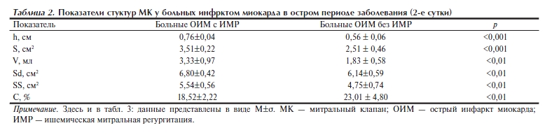 Таблица 2. Показатели стуктур МК у больных инфрктом миокарда в остром периоде заболевания (2 е сутки).