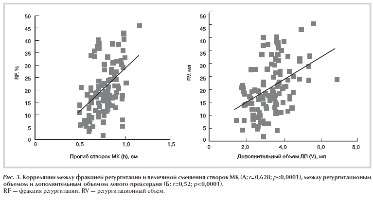 Результаты изучения корреляции между показателями деформации МК и количественными показателями ИМР отражают прямую корреляцию средней силы между исследуемыми показателями ИДМК и ИМР. Коэффициент корреляции между фракцией регургитации и величиной смещения створок МК составил 0,628 (p<0,0001), между регургитационным объемом (RV) и дополнительным объемом ЛП — 0,52 (p<0,0001) (рис. 3).