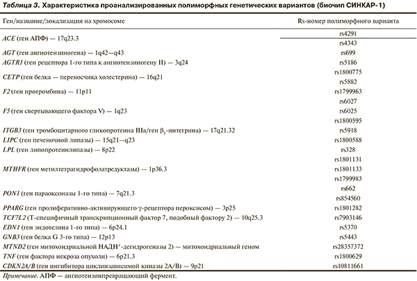 У всех пациентов определены генотипы по 32 полиморфным вариантам 24 важнейших генов-кандидатов ССЗ (табл. 3). Генотипирование проводили с помощью ДНК-чипа СИНКАР-1 (разработчики НИИ медицинской генетики СО РАМН и ООО «Геномная диагностика»). Использованный метод основан на технологии минисеквенирования (однонуклеотидного удлинения иммобилизированных праймеров). Процесс определения генотипов включал предварительную ПЦР-амплификацию исследуемых локусов (32 ПЦР-продукта); обработку щелочной фосфатазой и урацил-гликозилазой с целью фрагментации и удаления неиспользованных dNTP; проведение гибридизации и реакции однонуклеотидного удлинения праймеров на чипе (инкубация с флуоресцентно мечеными дидезоксинуклеозидтрифосфатами и ферментом секвеназой); отмывку реагентов с чипа; сканирование чипа в специальном сканере; анализ изображения и чтение результатов [7]. Чипы и реактивы для минисеквенирования, а также сканер чипов произведены в Эстонии. Приготовление смеси для реакции минисеквенирования осуществляли согласно протоколу производителя.