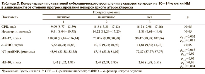 Для оценки роли неспецифического воспаления в прогрессировании некоронарного атеросклероза оценивали С-реактивный белок (СРБ), N-концевой фрагмент предшественника мозгового натрийуретического пептида (NT-proBNР) и некоторые маркеры воспаления на 10—14-е сутки от начала ИМ ввиду того, что только к концу госпитального периода имелась возможность исключить влияние остроты и площади некроза миокарда, медикаментозной терапии и метода реперфузии на процессы субклинического воспаления.