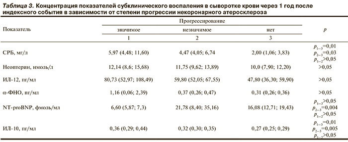 Результаты данного исследования позволяют утверждать, что ряд показателей, оцениваемых в течение госпитального периода ИМ, могут быть полезными в отношении выделения группы больных с возможным прогрессированием некоронарного атеросклероза в течение последующего года. К данным биомаркерам необходимо отнести пониженную концентрацию ИЛ-10 и повышенные уровни NT-proBNP. Через год после перенесенного ИМ повышенные уровни СРБ и ИЛ-10 также ассоциировались с более тяжелым прогрессированием атеросклероза. Кроме того, для оценки степени прогрессирования некоронарного атеросклероза имеет значение и направленность годовой динамики концентрации в сыворотке крови основных биологических маркеров. Так, у пациентов со значимым прогрессированием атеросклероза наблюдалось отсутствие снижения или даже повышение таких маркеров воспаления, как неоптерин и ИЛ-12, в то время как у пациентов без прогрессирования атеросклероза происходило снижение данных показателей.