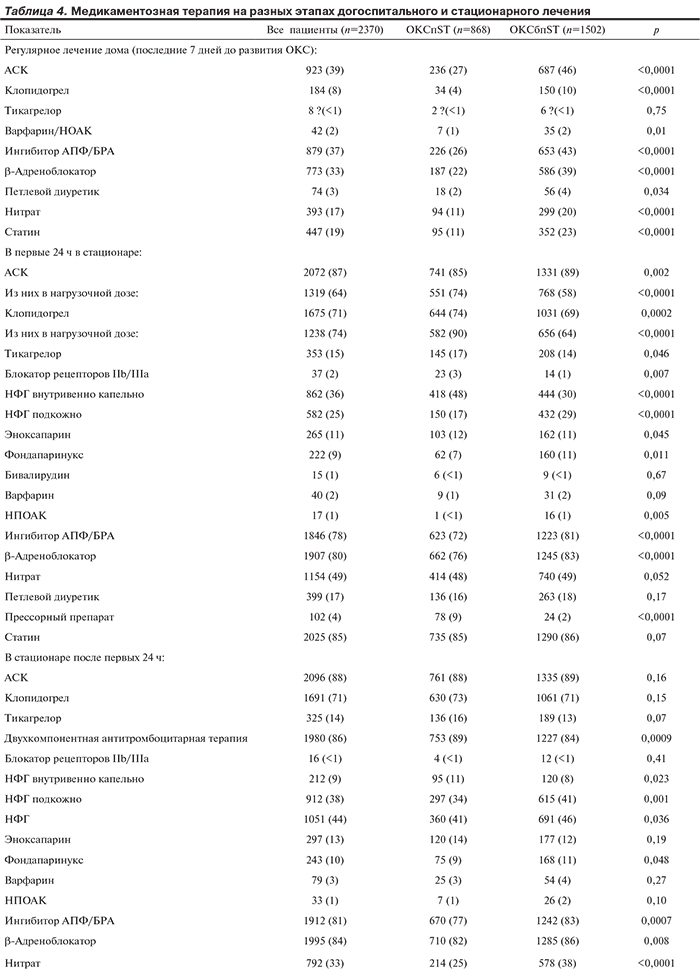 Данные о медикаментозном лечении пациентов с ОКСбпST представлены в табл. 4.