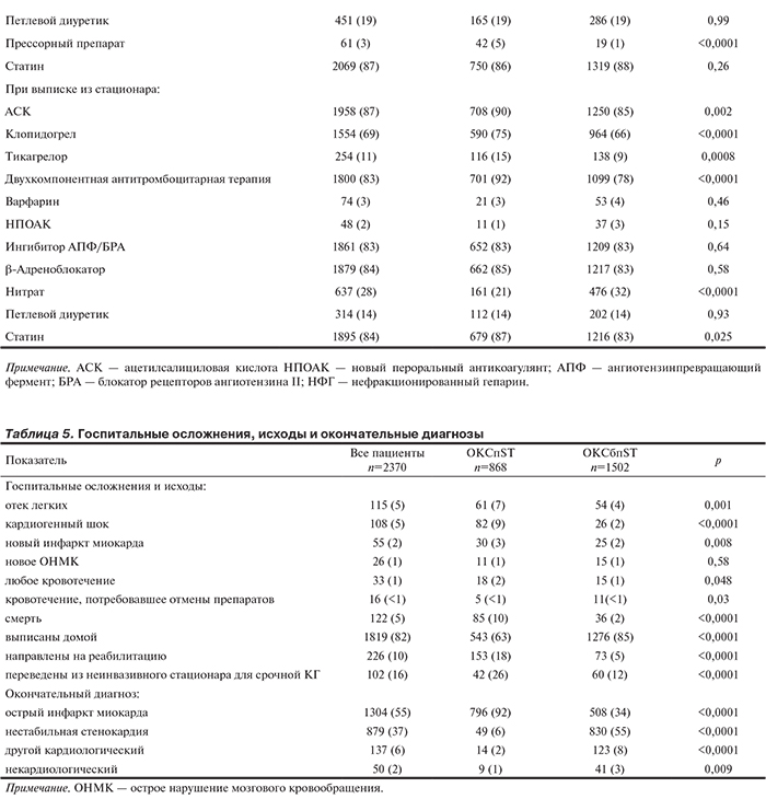 Медикаментозное лечение. Данные о медикаментозном лечении пациентов с ОКСпST представлены в табл. 4.