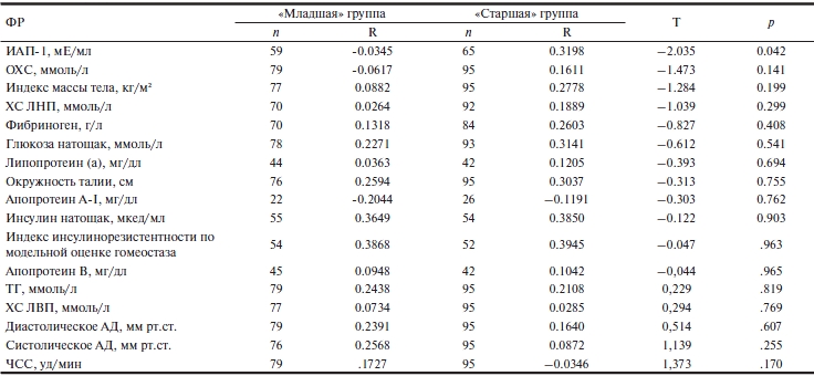 Откорректированные по полу и возрасту коэффициенты корреляции Спирмена (после z-трансформации по Фишеру) между супругами «младшей» (пробанд 32—47, супруг 28—53 лет) и «старшей» (пробанд 48—63, супруг 35—63 лет) возрастных групп достоверно не различались (кроме активности ИАП-1), (соответственно R=–0,035 и 0,320 p=0,042) (табл. 2).