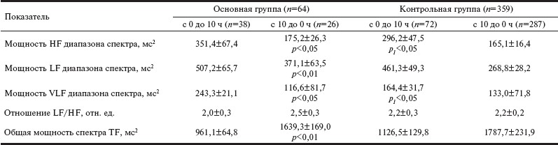 Таблица 3. Показатели спектрального анализа ВРС при ХМ ЭКГ у больных, включенных в исследование, в зависимости от времени возникновения ИМ.