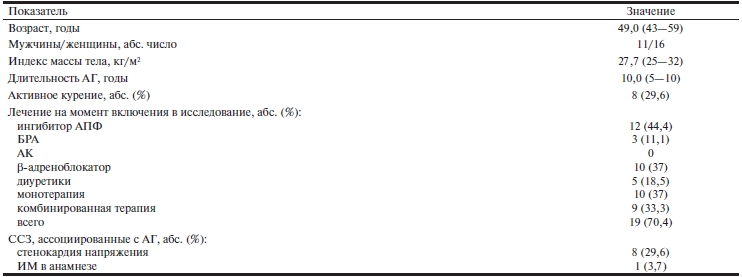 Исследование по протоколу полностью завершили 27 (90%) человек. Один пациент отказался от дальнейшего участия в испытании, у одной пациентки развился ишемический инсульт, у одного мужчины отмечено появление сухого кашля на фоне приема препарата, что явилось причиной его отмены. Исходная клиническая характеристика больных представлена в табл. 1.