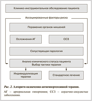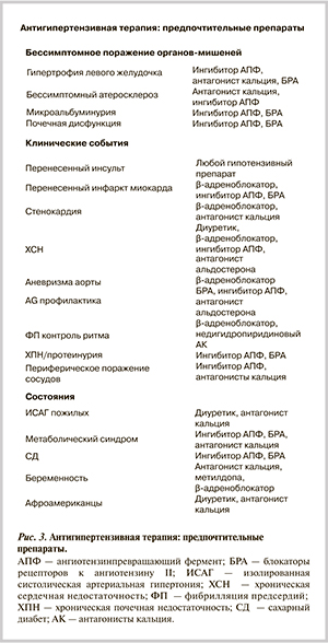 Терапевтические стратегии. К сожалению, в новых Европейских рекомендациях врачи не получили более или менее ясного алгоритма назначения АГТ, выбора класса или конкретного препарата. Европейские эксперты подтвердили позиции предыдущих рекомендаций, что основным механизмом достижения пользы АГТ является снижение АД как такового и что влияние препаратов на связанные с АГ исходы одинаково либо незначительно различается. Не подтверждено мнение о ранжировании АГП по их эффективности и влиянию на поражение органов-мишеней и прогноз. Однако европейские эксперты признают, что прогнозировать эффективность конкретного препарата у конкретного пациента невозможно, и все классы препаратов имеют свои преимущества и противопоказания. Предполагается, что при начале и продолжении АГТ врач должен учитывать «клинический портрет» пациента: наличие поражения конкретных органов-мишеней, клинические события, сопутствующие состояния (рис. 2, 3). Все это значительно усложняет выбор класса и конкретного препарата в реальной клинической практике, и начинают работать другие механизмы выбора, такие как клиническая привычка, шаблоны, принятые в конкретном лечебном учреждении, и т.д. Причина — отсутствие четкого и простого алгоритма терапии АГ. В то же время существуют примеры алгоритмированного похода к назначению АГП — Британские рекомендации по АГ (BHS — NICE. Guidelines, 2006 и 2011 гг.), которые по всем позициям критикуются в европейских рекомендациях.