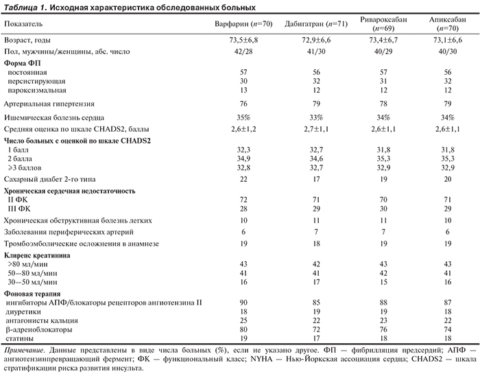 Обследованы 280 пациентов (163 мужчины и 117 женщин) в возрасте от 65 до 80 лет с неклапанной ФП, которых рандомизировали в 4 группы. В 1-ю группу вошли 70 больных, которым назначали варфарин в дозе, обеспечивавшей международное нормализованное отношение (МНО) в пределах от 2,0 до 3,0, 2-ю группу составил 71 пациент, получавший дабигатран в дозе 110 мг 2 раза в сутки. В 3-й и 4-й группах 69 и 70 больных получали ривароксабан в дозе 20 мг/сут и апиксабан в дозе 5 мг 2 раза в сутки соответственно.
