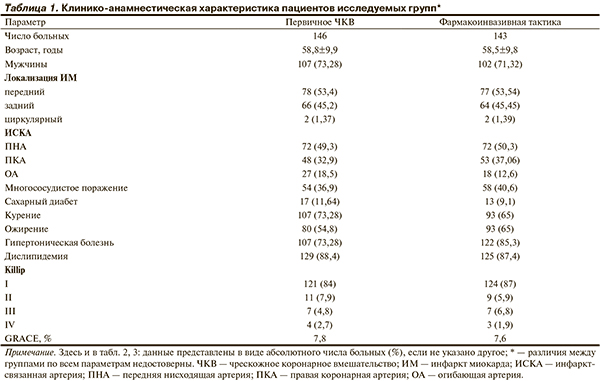 Как представлено в таблице 1, по основным клиникоанамнестическим характеристикам и риску летального исхода в течение 30 дней по шкале GRACE группы пациентов между собой не различались.