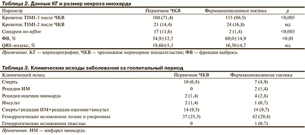 Эффективность ангиопластики по частоте достижения кровотока TIMI-3 после ЧКВ была выше в группе фармакоинвазивной тактики: 80,5% против 71,4% (р<0,005). Частота развития синдрома no-reflow была значительно ниже во 2-й группе: 1,4% против 11,6% (р<0,003). В группе первичного ЧКВ с развившимся синдромом no-reflow 2 пациента умерли на фоне кардиогенного шока.