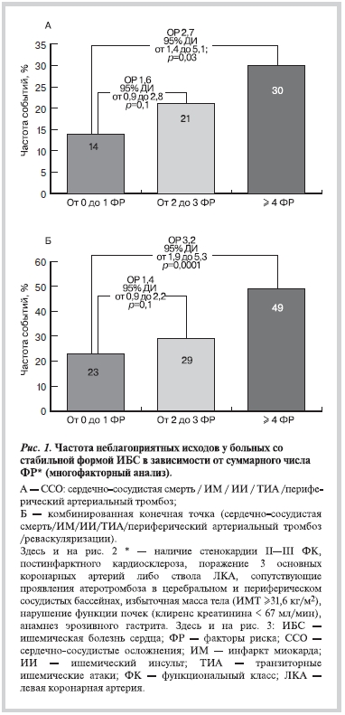 По результатам многофакторного анализа, проведенного с поправкой на пол и возраст, прогноз у больных определялся количеством ФР. При увеличении суммы ФР у больного возрастала частота как атеротромботических осложнений, так и всех ССО, включая потребность в процедурах реваскуляризации пораженного сосудистого бассейна (рис. 1).