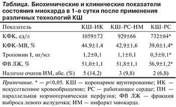 Результаты сравнительной оценки биохимических и клинических показателей состояния миокарда в 1-е сутки после проведения различных технологий КШ представлены в таблице.
